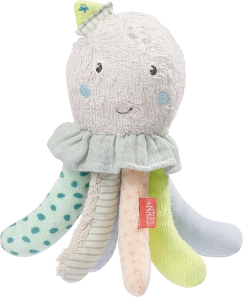 Kąpiel będzie od teraz jeszcze bardziej zabawna. Ośmiornica ze zintegrowaną piłeczką unosi się na powierzchni, zachęca dzieci do odkrywania wody i wspiera rozwój zmysłów oraz małej motoryki. Połączenie miękkich tkanin – frotte, muślin, welur, bouclé oraz drukowana tkanina – jest przyjemne w dotyku i delikatne dla wrażliwej skóry dziecka.