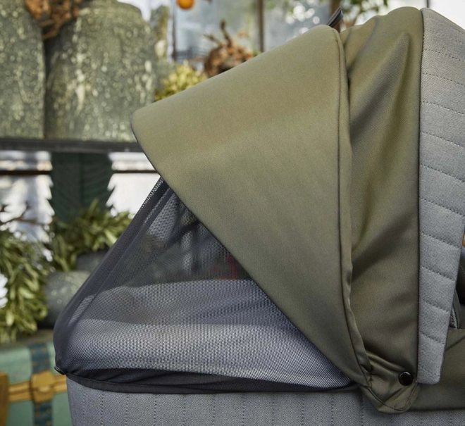 Bogate wyściełanie, szeroka budka z okienkiem i moskitierą, regulowany zagłówek w 4 pozycjach oraz kołysząca podstawa dla spokojnego snu dziecka.