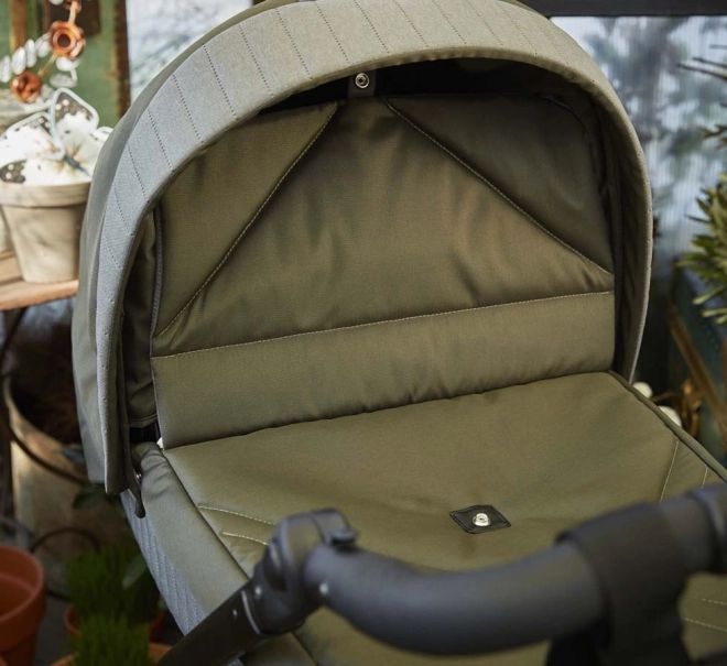 Regulowany zagłówek w 4 pozycjach, szeroka budka z okienkiem i moskitierą oraz kołyskowa podstawa z miękkim materacykiem dla spokojnego snu.