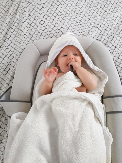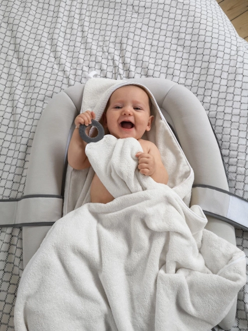 Mięciutki ręcznik z kapturem Doomoo Dry&Play to nie jest zwykły ręcznik. Dzięki sprytnej silikonowej obręczy rodzice mogą łatwo przypiąć go wokół szyi, zyskując wolne ręce do wygodnego i bezpiecznego mycia maluszka, a przy tym są chronieni przed ochlapaniem. Po kąpieli dziecko można wygodnie otulić ręcznikiem trzymanym na rękach, a silikonowa obręcz posłuży jako gryzak.