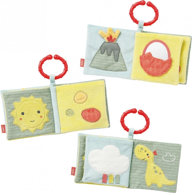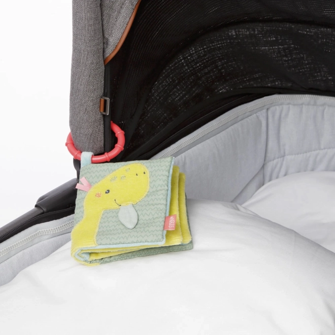 Z materiałową pluszową książeczką dzieci mogą na 8 stronach ożywić urocze prehistoryczne stworzenia. Każda strona ma różne zabawne efekty, takie jak piszczałka, szeleszczący papier, pluszowe jajeczka czy lusterko. Książeczka rozwija chwyt, dotyk, wyobraźnię i małą motorykę. Praktyczny pierścień mocujący umożliwia łatwe przymocowanie do łóżeczka, wózka lub fotelika samochodowego.