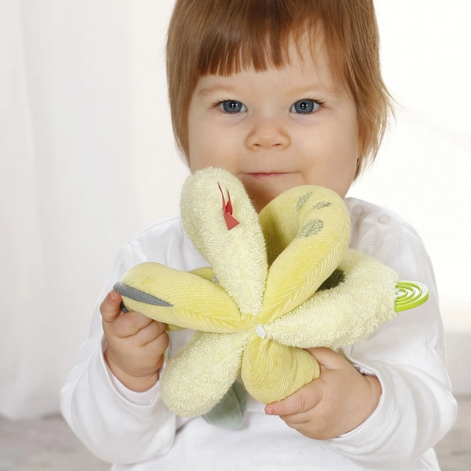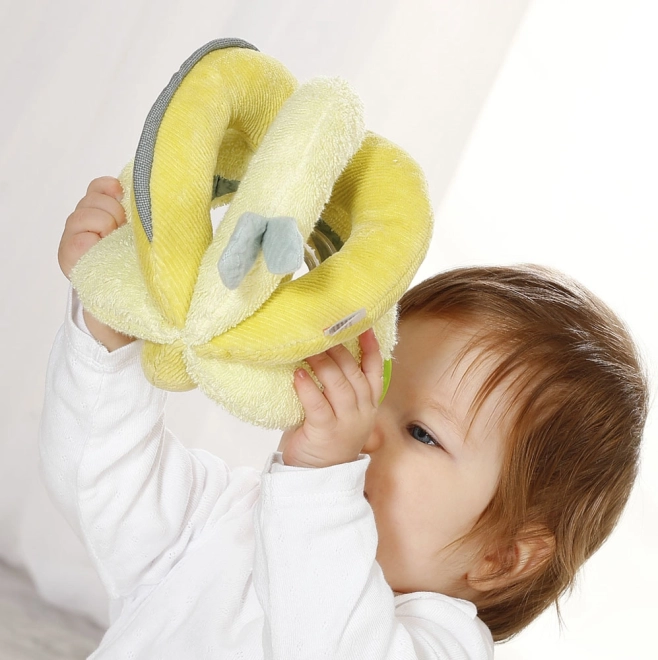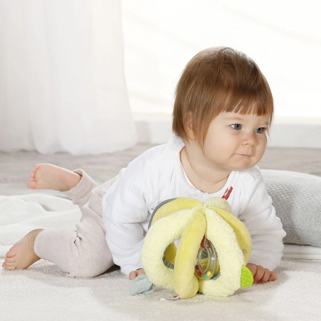 Miękka piłka została wykonana z wysokiej jakości sztruksu i frotty, a wypełniona jest pluszem. Wspiera naturalną ciekawość dzieci i wręcz zachęca do turlania, rzucania i zabawy. Piłka jest wyposażona w grzechotkę, szeleczący papier i piszczałkę. Podczas zabawy wspiera prawidłowy rozwój motoryki, koordynacji, zmysłów i wyobraźni. Dzięki praktycznemu rozmiarowi piłkę można łatwo przenosić, a także mieści się do wózka, fotelika samochodowego i dziecięcego łóżeczka.