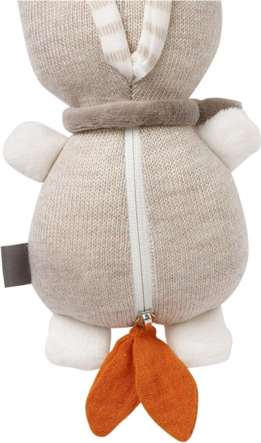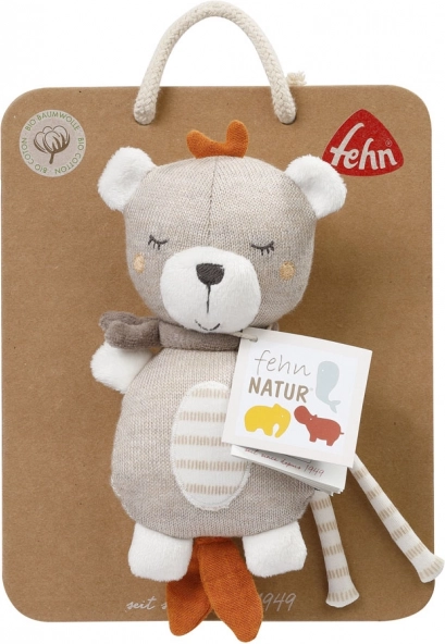 Uroczy, miękki pluszowy miś wykonany jest z certyfikowanej bawełny organicznej. Wewnątrz pluszowej zabawki znajduje się mechanizm nakręcany, który po pociągnięciu odtwarza kołysankę o przyjemnej głośności. Dwie praktyczne wstążki umożliwiają przymocowanie zabawki do wózka, łóżeczka lub fotelika samochodowego, zapobiegając jej zgubieniu.