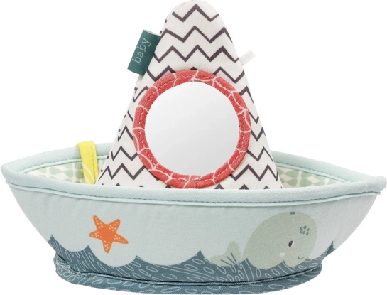 Z kąpielową łodzią maluszek zostanie kapitanem. Łódź unosi się na wodzie i zapewnia świetną zabawę podczas kąpieli. Ukryty szeleszczący papier wraz z lusterkiem rozwijają dziecięcą wyobraźnię, małą motorykę i zmysły. W zestawie znajduje się także pacynka na palec w kształcie uroczego krokodyla.