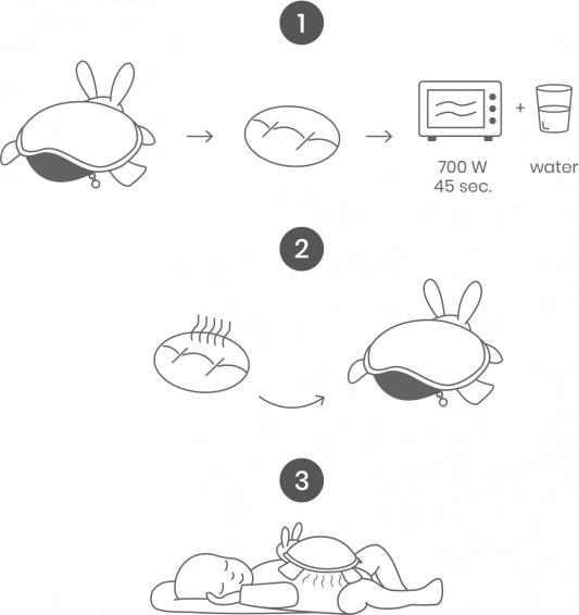Praktyczna konstrukcja pozwala łatwo wyjąć i podgrzać poduszkę, a pluszowy pokrowiec pozostaje czysty i gotowy do przytulania. Pokrowiec można prać w pralce w 30 °C (bez poduszki), dzięki czemu produkt jest higieniczny i odpowiedni do codziennego użytku.