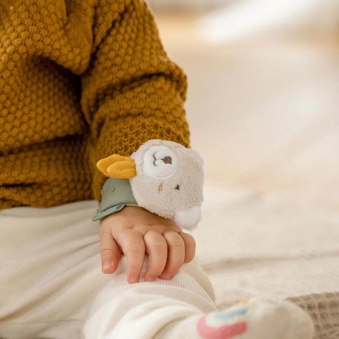 Łatwo zakłada się na rączkę, a przy ruchach dziecka – potrząsaniu rączkami – wydaje fascynujące dźwięki, które maluchy uwielbiają. Grzechocząca bransoletka w zabawny sposób wspiera słuch, chwyt i dotyk niemowlęcia oraz małą motorykę.