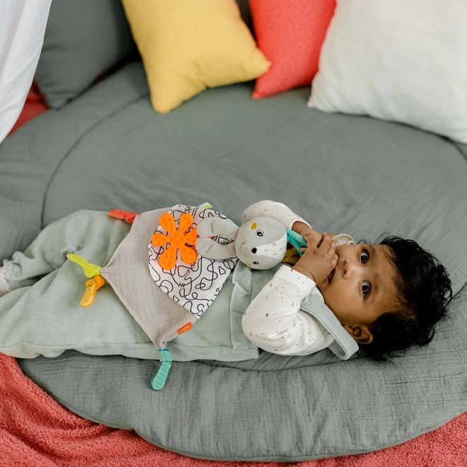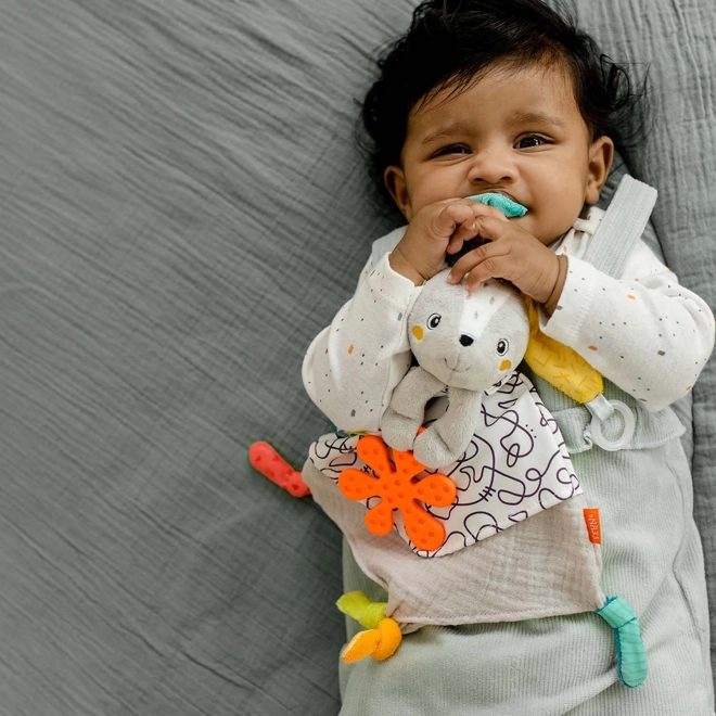 Wiele elementów do chwytania, miękkie materiały i główka króliczka to detale, które stymulują zmysły niemowlęcia, wspierając rozwój dotyku. Praktyczny pierścień na smoczek zapobiega jego zgubieniu podczas każdej przygody. Neonowo pomarańczowy gryzak pomaga przy ząbkowaniu.