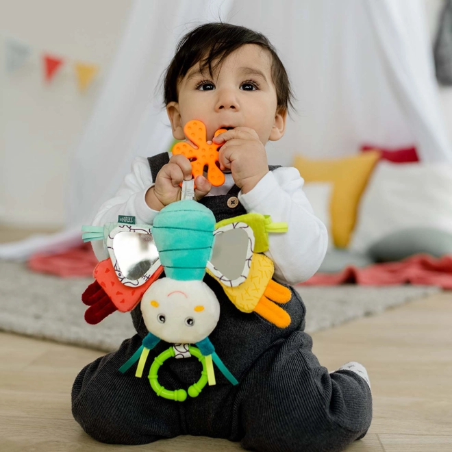 Kolorowe elementy do chwytania wspierają zmysł wzroku, dotyku, chwytu i słuchu, a miękki gryzak w kształcie gwiazdy pomaga przy ząbkowaniu. Niemowlęta będą ćwiczyć swoją pewność siebie dzięki bezpiecznemu lusterku, a zabawne dźwięki wydawane przez grzechotkę będą je fascynować i bawić przez długi czas.