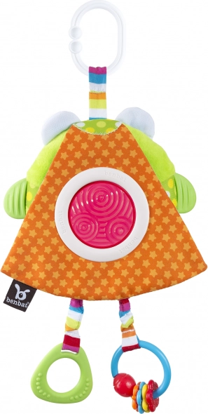 Jasne kolory, uroczy pluszowy zwierzęcy przyjaciel, wstążki i grzechotki nie tylko bawią dzieci, ale także rozwijają ich psychomotoryczne umiejętności. Grzechotka w brzuszku pluszowego zwierzątka uczy dziecko skupiać się i rozpoznawać dźwięki, a ruchome elementy trenują koordynację „oko–ręka”. Łatwy do przymocowania klips do wózków, fotelików samochodowych i innych zapewnia, że zabawka będzie zawsze skierowana w stronę dziecka. Części plastikowe nie zawierają BPA. Odpowiednia od urodzenia.