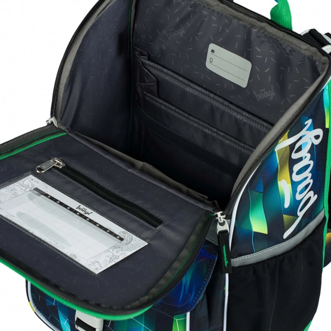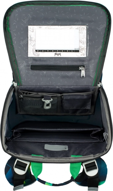 Przemyślane wnętrze obejmuje odchylany system otwierania dla łatwego dostępu prosto z ławki, przezroczystą kieszeń na plan lekcji, wewnętrzny organizer z gumką oraz izolowaną przednią kieszeń na drugie śniadanie. Boczne kieszenie z mocnego materiału mieszczą butelkę na napój, a solidne dno zapewnia, że tornister samodzielnie stoi.