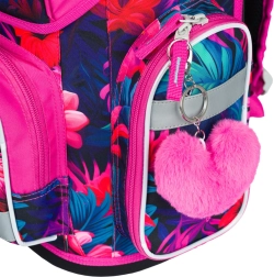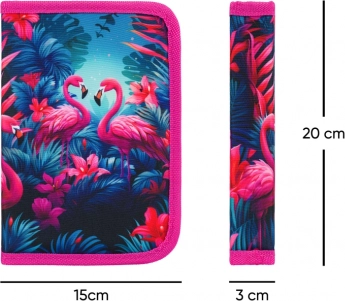 Tornister uzupełnia jednopiętrowy piórnik bez wyposażenia oraz solidny worek z karabińczykiem do przypięcia do tornistra. Wszystko w radosnym tropikalnym motywie z flamingami.