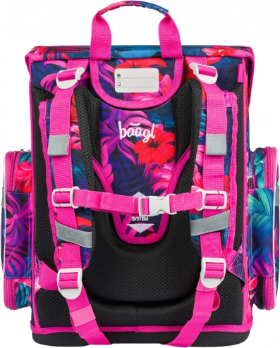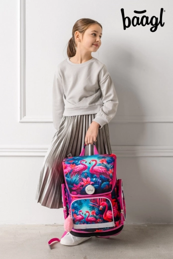 Stylowy zestaw szkolny BAAGL Ergo Flamingi dla pierwszych klas szkoły podstawowej zawiera ergonomiczny tornister, jednopiętrowy piórnik oraz worek na obuwie. Tornister oferuje regulowany system nośny, magnetyczne zapięcie Fidlock, niską wagę oraz elementy odblaskowe dla bezpieczeństwa. Piórnik i worek utrzymane są w tym samym tropikalnym wzorze z flamingami.