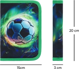 Worek z przednią kieszenią na zamek i sznurkami do noszenia na plecach uzupełnia jednoprzegrodowy piórnik na zamek – wszystko w dynamicznym piłkarskim motywie.