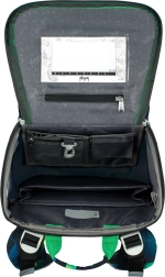Przemyślany podział tornistra z odchylanym otwieraniem umożliwia szybki dostęp do przyborów prosto z ławki, a wewnętrzny organizer z gumką dba o równomierne rozłożenie ciężaru. Nie brakuje izolowanej przedniej kieszeni na drugie śniadanie, solidnych bocznych kieszeni np. na butelkę oraz wyraźnych elementów odblaskowych dla większego bezpieczeństwa.