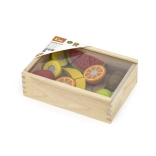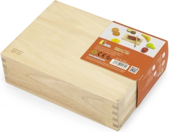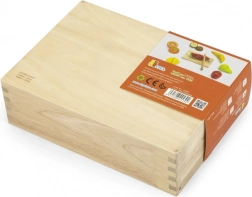 Praktyczne drewniane pudełko z przezroczystą pokrywką pełni funkcję pojemnika do przechowywania oraz małej witrynki ekspozycyjnej, dzięki czemu wszystkie elementy są zawsze razem. Zestaw świetnie sprawdza się do samodzielnej zabawy i wspólnego gotowania z rodzicami.