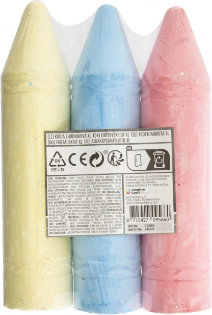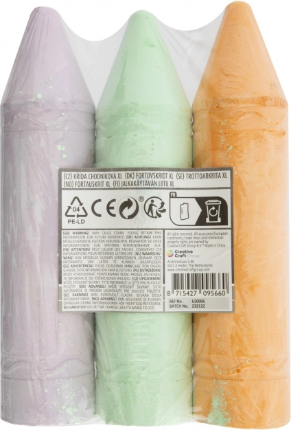 Ubogacaj swoje rysunkowe aktywności dzięki tym kolorowym kredom XL, które są dostępne w dwóch wariantach - żółty, niebieski i różowy lub pomarańczowy, zielony i fioletowy. Każdy zestaw zawiera trzy kredy o optymalnej długości 19 cm, co ułatwia chwyt podczas rysowania.