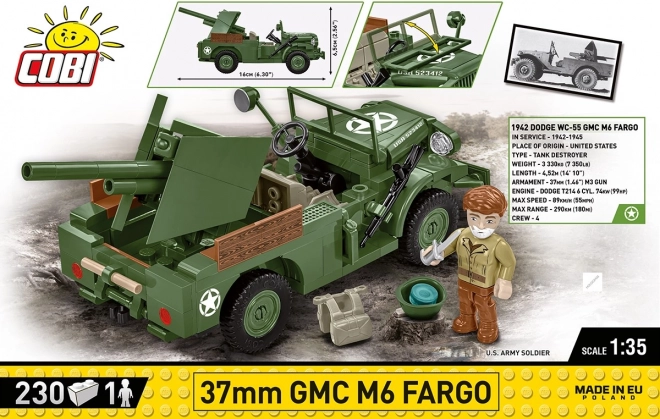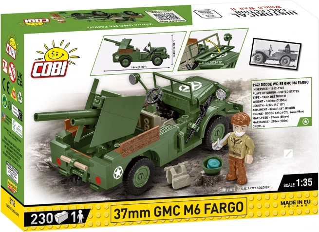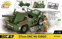 37 mm GMC M6 Fargo to amerykański lekki pojazd opancerzony używany podczas II wojny światowej. Opracowany na podwoziu ciężarówki Dodge WC, wyposażony był w 37 mm armatę przeciwpancerną M3, co czyniło go skutecznym w walce z lekkimi pojazdami pancernymi i umocnieniami. Ten model klockowy marki COBI wykonano w skali 1:35 i składa się z 230 elementów.