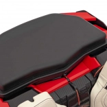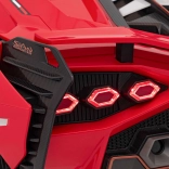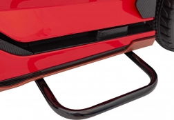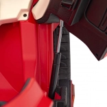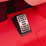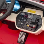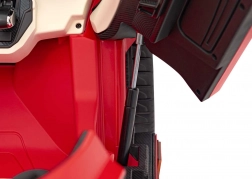 Komfort zwiększają miękkie koła EVA (25 × 9 cm) z tylnymi amortyzatorami, siedziska z ekoskóry z pasami bezpieczeństwa oraz praktyczne detale, takie jak otwierane do góry drzwi, światła LED z przodu i z tyłu oraz podświetlany start z efektem dźwięku silnika. Rozszerzony panel audio z kolorowym wyświetlaczem obsługuje Bluetooth, USB, MP3, AUX i ma także wgrane melodie oraz przyciski dźwięków na kierownicy.