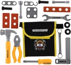 Odkryj zabawną i bezpieczną zabawę w majsterkowicza z tym kompletnym dziecięcym zestawem narzędzi z paskiem. Zawiera wszystko, czego mali majsterkowicze potrzebują: młotek, szczypce, śrubokręt, klucze, kątownik, śruby, nakrętki i podkładki. Praktyczny tekstyliany pas na narzędzia trzyma wszystko pod ręką i wspiera rozwój motoryki małej, wyobraźni i samodzielności.