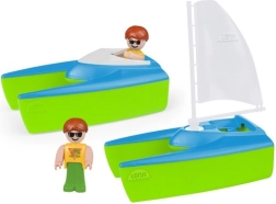 Zestaw żaglówek Katamaran Lena do zabawnej gry przy wodzie. Zawiera żaglówkę i katamaran z żaglem oraz dwie figurki surferów.