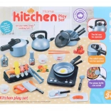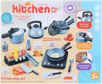 Zestaw obejmuje również czajnik na wodę, patelnię, garnek, szybkowar, grill i ponad 30 innych elementów kuchennych, takich jak szczypce i imitacje produktów spożywczych. Doskonały do stymulacji kreatywnej zabawy i wspierania rozwoju umiejętności motorycznych.