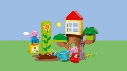 Kreatywna zabawka zawiera dwadzieścia elementów, w tym figurki Peppy i George’a. Dzieci mogą spędzać czas w ogrodzie lub bawić się w chowanego. Domek na drzewie dodatkowo zapewnia przestrzeń do odpoczynku lub zabawy przez okno na zawiasach, co rozwija koordynację i małą motorykę.