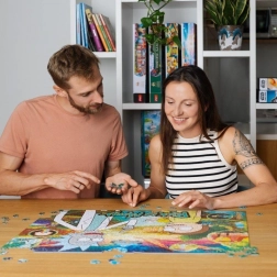 Wyjątkowa grubość kartonu sprawia, że ułożone części trzymają się razem nawet podczas przenoszenia. Układanie ułatwia dołączona ilustracja poglądowa. Puzzle są pakowane w sposób przyjazny dla środowiska – pudełko nadaje się do recyklingu i jest zaklejone wyłącznie naklejkami.