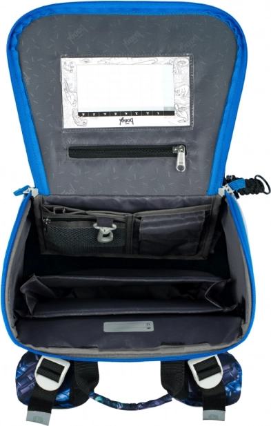 Przemyślany układ wnętrza z odchylanym otwieraniem umożliwia szybki dostęp do przyborów prosto z ławki. Nie brakuje przezroczystej kieszeni na plan lekcji, wewnętrznego organizera z gumką do mocowania, izolowanej przedniej kieszeni na drugie śniadanie, solidnych bocznych kieszeni na butelkę, wytrzymałego dna dla stabilności oraz wyraźnych elementów odblaskowych dla bezpieczeństwa. Zestaw uzupełnia jednopoziomowy piórnik z zamkiem YKK oraz praktyczny worek z karabińczykiem i dolną kieszenią na zamek.