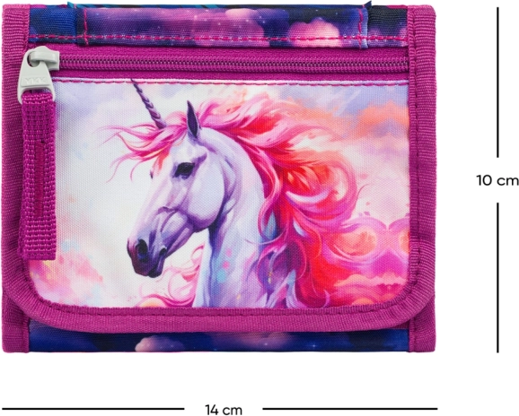 Wewnętrzny układ zaprojektowano z myślą o przejrzystym przechowywaniu banknotów, kart i legitymacji, nie brakuje też osobnej kieszonki na monety na zamek. Rzep niezawodnie utrzymuje zawartość zamkniętą. Kolorystyka z jednorożcem i gwiezdnym motywem przyciąga wzrok i świetnie komponuje się z innymi dodatkami.