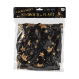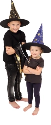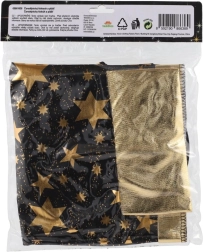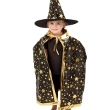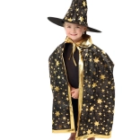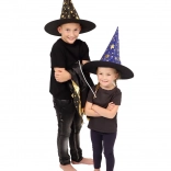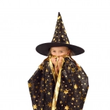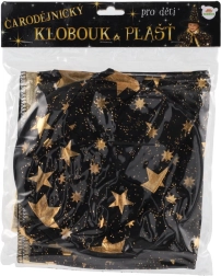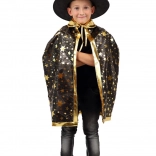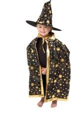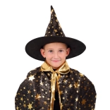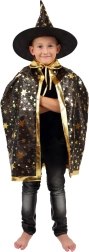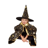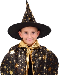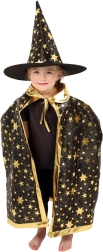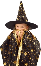Przemień swoje dziecko w małego czarodzieja. Ten czarno‑złoty zestaw z nadrukiem gwiazd zawiera efektowny kapelusz czarodziejski i pasującą pelerynę, które doskonale sprawdzą się na dziecięcych balach karnawałowych, przebieranych oraz imprezach halloweenowych. Dzięki lekkim materiałom łatwo się je nosi i umożliwiają swobodę ruchów podczas zabaw i występów.