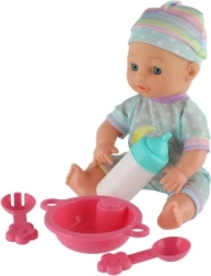 W zestawie znajdują się miska, łyżeczka, widelec i kolorowa buteleczka, dzięki którym dzieci poćwiczą opiekę nad niemowlęciem i odgrywanie karmienia.