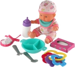W zestawie znajdują się butelka, grzechotka, chusteczki nawilżane oraz zestaw do karmienia dla maluchów, które wspierają realistyczną zabawę i rozwijają umiejętności motoryczne oraz role społeczne.