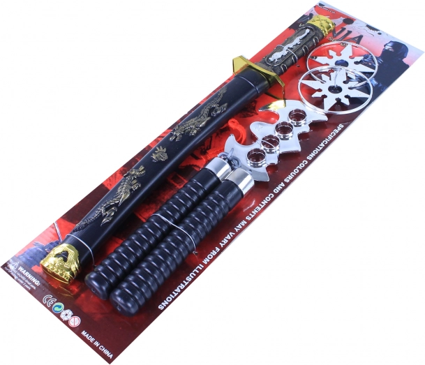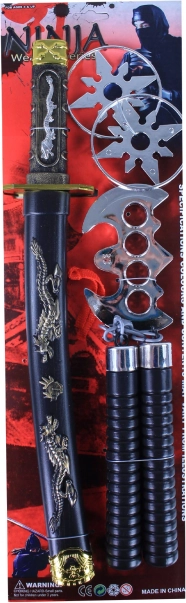 Dzięki temu zestawowi zabawek ninja każdy mały wojownik może przenieść się do świata sztuk walki. Zestaw zawiera miecz katana z pochwa, zdobiony szczegółowymi ornamentami, oraz inne zabawki jak shurikeny i nunchaku, aby doskonale wcielić się w rolę wojownika.