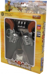 Zestaw zapakowany jest w kartonowo-plastykowe opakowanie z grafiką w stylu western, idealny jako prezent dla każdego małego rewolwerowca.