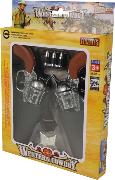 Stylowy zestaw dla małych rewolwerowców! Ten unikalny zestaw kowbojski zawiera dwa pistolety w czarnych kaburach, odznakę szeryfa oraz regulowany pas z uchwytami na naboje. Idealny dla dzieci od 3 lat, które chcą wcielić się w rolę kowbojów lub szeryfów.