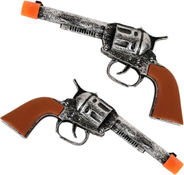 Pistolety mają srebrne korpusy z brązowymi rękojeściami oraz wyraźne tłoczenia, które nadają im autentyczny wygląd.