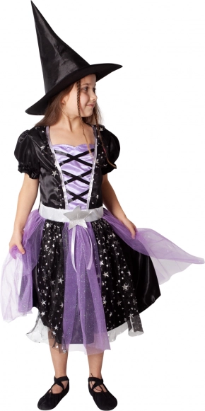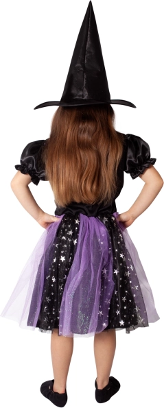Czarno‑fioletowa sukienka zdobiona srebrnymi gwiazdkami gwarantuje, że Twoja mała czarownica będzie w centrum uwagi na każdej imprezie.