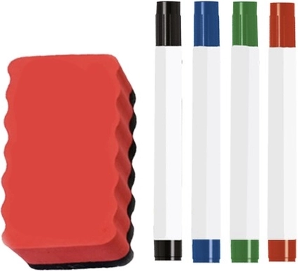 Wszystko, co potrzebne, znajdziesz w zestawie – 4 mazaki, 10 magnesów i 1 magnetyczna guma.