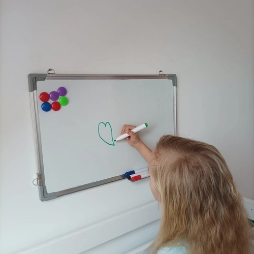 Ta magnetyczna tablica jest idealna do codziennego użytku w biurach, szkołach lub w domowym otoczeniu. Jej powierzchnia pozwala na łatwe pisanie i rysowanie dostarczonymi mazakami, które można po napisaniu łatwo usunąć magnetyczną gumą. Tablica posiada praktyczne uchwyty do zawieszenia oraz półkę na akcesoria, gdzie umieścisz wszystkie potrzebne narzędzia.