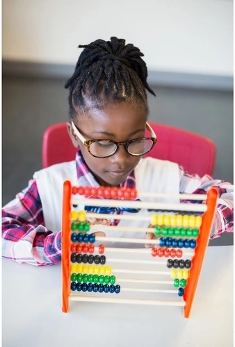 Każdy z 10 rzędów zawiera 10 koralików w nasyconych kolorach, które wspierają orientację wzrokową, dodawanie i odejmowanie krok po kroku.