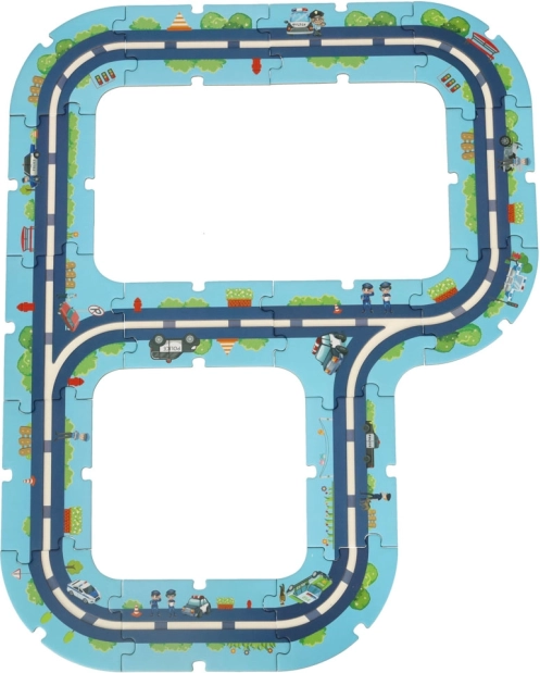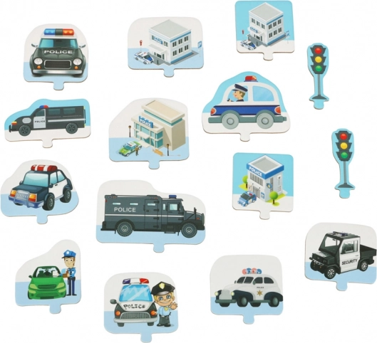 Ta wyjątkowa układanka daje dzieciom możliwość zbudowania własnego policyjnego miasteczka. 38 puzzli pozwala stworzyć własną sieć krętych ulic, po których dzieci mogą jeździć radiowozami i czuwać nad porządkiem. Zestaw zawiera także specjalne elementy, które można swobodnie rozmieszczać na podstawach, tworząc nowe elementy infrastruktury.