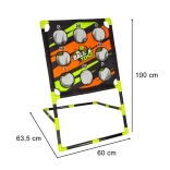 Czytelnie oznaczone wyniki 5, 10 i 20 punktów wspierają uczciwe współzawodnictwo i motywują do systematycznej poprawy. Sześć perforowanych piłeczek o średnicy ok. 7 cm jest bezpiecznych i wygodnych w chwycie – idealnych do ćwiczenia techniki, szybkości i siły rzutu.