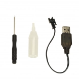 W zestawie znajdziesz kabel do ładowania USB dla wygodnego doładowania akumulatora, śrubokręt oraz pojemniczek na wodę do efektu pary. Kontrolery zasilane są standardowymi bateriami AA/AAA (brak w zestawie).