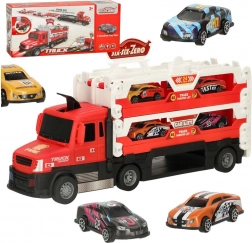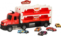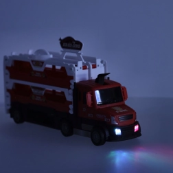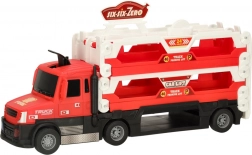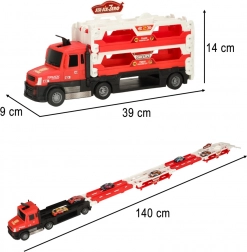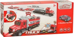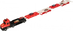 Ogromna czerwona ciężarówka służy jako transporter aut, a jednocześnie jako zestaw do zabawy z ukrytym torem wyścigowym. Po rozłożeniu powstaje długi tor, na którym 6 dołączonych autek może się ścigać. Zintegrowana rampa katapultująca zapewnia mocny start, a światła i dźwięki potęgują atmosferę prawdziwych zawodów.