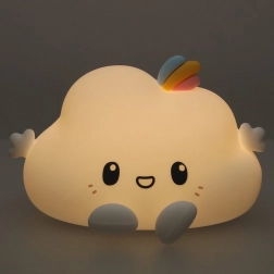 Ta dziecięca nocna lampka w formie uśmiechniętej chmurki wprowadzi do pokoju spokój i przytulność. Miękki silikon jest przyjemny w dotyku i bezpieczny dla dzieci, a delikatne światło pomaga pokonać strach przed ciemnością i wspiera spokojne zasypianie.