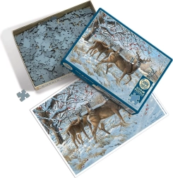 Ciesz się wyjątkowym wyzwaniem z puzzlami Jelenie zimą od marki Cobble Hill. Nietypowy kształt elementów i brak standardowej siatki zapewniają dłuższe i bardziej wciągające układanie.