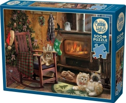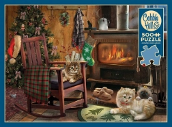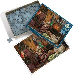 Układanka przedstawia świąteczną scenę z kociętami przy kominku, idealną do stworzenia odświętnej atmosfery w domu.