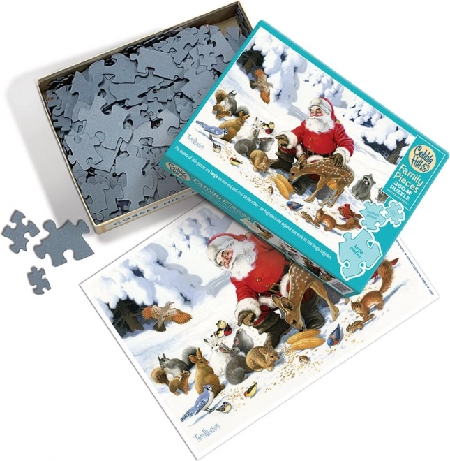 Odkryj magię Świąt z rodzinnymi puzzlami COBBLE HILL „Święty Mikołaj z przyjaciółmi zwierzętami”. Dzięki trzem rozmiarom elementów każdy znajdzie własne tempo, a układanie stanie się przyjemną rodzinną aktywnością. Duże elementy są odpowiednie dla młodszych dzieci, średnie dla uczniów i dziadków, a małe dla bardziej doświadczonych układaczy.