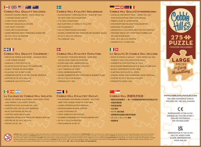 Puzzle COBBLE HILL Koty na farmie XL łączą piękny, wiejski motyw z praktycznym wykonaniem ułatwiającym układanie. Dzięki 275 ekstra dużym elementom (ok. 3 cm) doskonale nadają się do spokojnego układania i dłuższych wieczorów z rodziną. W zestawie znajduje się także kolorowa plansza poglądowa o wymiarach 31,6 × 22,9 cm dla jeszcze przyjemniejszych wrażeń.