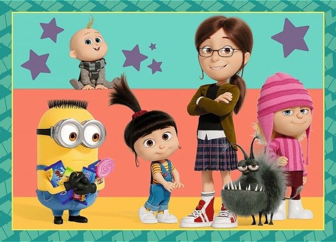 Dziecięce puzzle 4 w 1 z motywami ze świata filmowego Gru i Minionki oferują cztery oddzielne układanki o wymiarach 285 × 205 mm. Różna liczba elementów jest idealna dla młodszych i starszych dzieci oraz wspiera rozwój motoryki małej, cierpliwości i logicznego myślenia. Wyprodukowano w Polsce z materiałów ekologicznych.